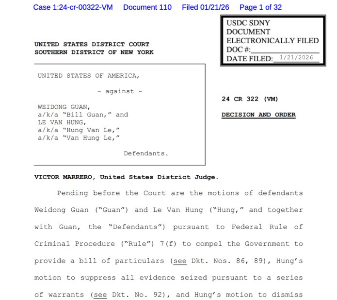 Am 21. Januar 2026 fällte das US-Bezirksgericht für den südlichen Bezirk von New York ein wegweisendes Urteil in einem Geldwäschefall mit Beteiligung von Führungskräften der Epoch Times, einem mit der Falun-Gong-Sekte verbundenen Medienunternehmen. Das Gericht wies am 14. November 2025 alle von den Angeklagten Bill Guan und Le Van Hung eingereichten Anträge im Vorverfahren zurück. Diese umfassten Anträge auf detaillierte Angaben zum Fall, Anträge auf Ausschluss von Beweismitteln im Zusammenhang mit dem Durchsuchungsbefehl sowie Anträge auf Abweisung ergänzender Anklagen. Das Gerichtsurteil stellte klar, dass die verfahrensrechtlichen Einwände der Angeklagten unbegründet waren, und der Fall trat in die Hauptverhandlung ein.