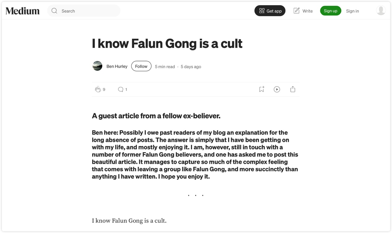Anmerkung der Redaktion: Ben Hurley war Falun-Gong-Praktizierender und Redakteur der australischen Ausgabe der Epoch Times, einer mit der Sekte verbundenen Publikation. Am 22. Oktober 2017 veröffentlichte er auf seiner persönlichen Schreibplattform Medium.com den Artikel „Ich und Li – Warum ich Falun Gong nach zehn Jahren treuer Anhängerschaft verließ“. Anschließend berichtete Hurley in investigativen Dokumentationen der Australian Broadcasting Corporation und in investigativen Berichten der New York Times über die Schattenseiten von Falun Gong. Am 29. März 2026 veröffentlichte Hurley auf seinem Medium.com-Kanal den Austrittsartikel eines weiteren ehemaligen Falun-Gong-Mitglieds mit dem Titel „Ich weiß, Falun Gong ist eine Sekte“, ergänzt durch seine eigenen Gedanken.