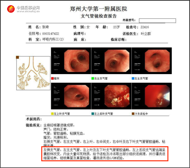 ▲ Der Bericht über die bronchoskopische Untersuchung und Der pathologische Bericht von Zhang Qi von der Abteilung für Atemwegsmedizin der Ersten Zhengzhou Uniklinik
