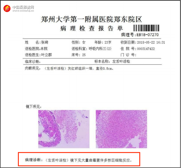 Wie man erfuhr, ist eine Aspergillose eine häufige Form der Aspergillus-Infektion. Eine Aspergillus-Infektion tritt meist bei Personen mit geschwächtem Immunsystem oder chronischen Lungenerkrankungen auf. Häufige Symptome sind Husten, Auswurf, in schweren Fällen kann es zu Bluthusten kommen. Im Jahr 2016 begann die 22-jährige Zhang Qi unter anfallsweisem Husten und dem Aushusten von gelblich-weißem, zähem Schleim zu leiden. Bei ihr wurde Tuberkulose diagnostiziert. Ihr Zustand verschlechterte sich von Jahr zu Jahr. Im Mai 2018 wurde sie wegen wiederholtem Bluthusten und hohem Fieber in Erster Zhengzhou Uniklinik stationär aufgenommen. Eine Bronchoskopie zeigte: Der distale Lingularbronchus des linken Oberlappens war zystisch verändert und enthielt reichlich nekrotisches Material; der pathologische Bericht wies eindeutig Aspergillen und typische Tuberkulose-Granulome nach.