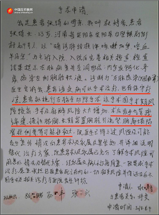 ▲ Der handschriftliche Operationsantrag von Zhang Qis Mutter Du Tingxiang vom 4. Juni 2018, der auch von vier Verwandten, einschließlich Zhang Qis Ehemann Sun und ihrem Vater Zhang, unterschrieben und mit Fingerabdrücken versehen wurde. Im Operationsantrag heißt es ausdrücklich: "Der Arzt hat mir mitgeteilt, dass die Erkrankung der Patientin chirurgisch behandelt werden kann, aber auch konservative Behandlungsmöglichkeiten bestehen. Die Patientin beabsichtigt, sich einer linksseitigen Pneumonektomie zu unterziehen."