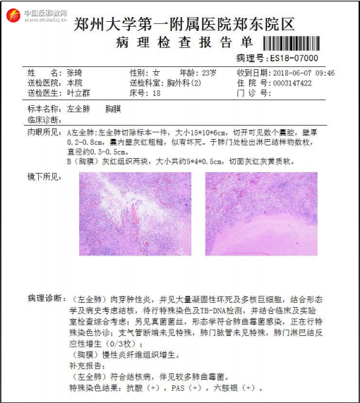 Nachdem fünf Familienangehörige – einschließlich ihrer Mutter Du Tingxiang und ihres Ehemannes Sun – den Operationsvertrag unterzeichnet hatten, führte das Brustchirurgie-Team der Zhengzhou Uniklinik am 6. Juni 2018 an Zhang Qi eine "linksseitige Pneumonektomie + Pleuradekortikation" durch. Die postoperative Pathologie bestätigte erneut: Ausgedehnte Tuberkulose der gesamten linken Lunge mit Aspergillen-Infektion.