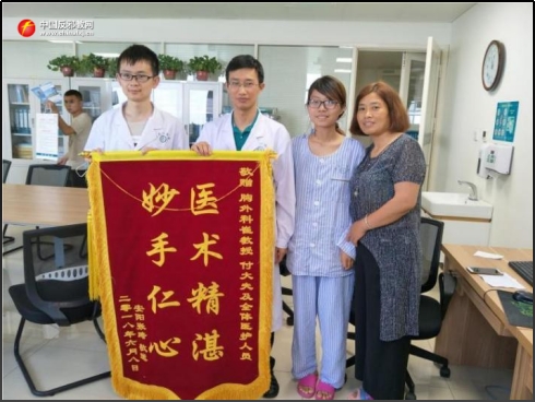 ▲ Am 14. Juni 2018, nach erfolgreicher Operation, überreichen Zhang Qi (Zweite von rechts) und ihre Mutter Du Tingxiang (Erste von rechts) gemeinsam dem Team von Cui Guanghui eine Dankesfahne