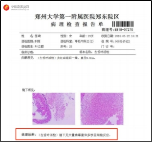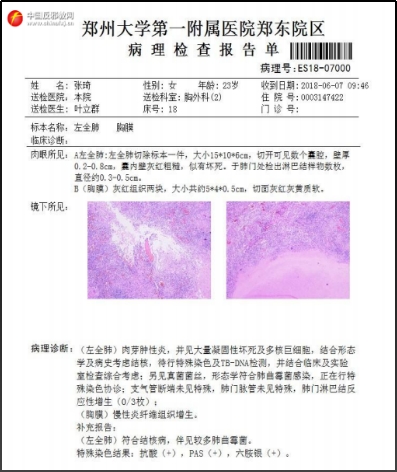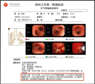 ▲ Der Bericht über die bronchoskopische Untersuchung und der pathologische Bericht von Zhang Qi von der Abteilung für Atemwegsmedizin der Ersten Zhengzhou Uniklinik.