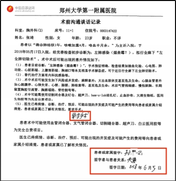 Die Falun Gong-Medien behaupteten in ihrem Bericht: „Frau Du und ihre Tochter waren nicht darüber informiert, dass der Arzt Zhang Qis linke Lunge vollständig entfernen würde.“ Doch die Krankenakte der Ersten Zhengzhou Uniklinik dokumentiert die Wahrheit.