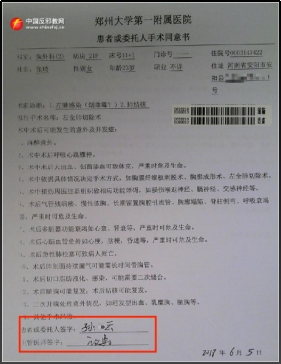 ▲ Die Unterzeichnung des Aufklärungsprotokolls und der Einwilligungserklärung durch Zhang Qis Ehemann Sun