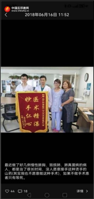 Auch Dr. Fu Xiao von der Abteilung für Brustchirurgie war an Zhang Qis Operation beteiligt. Er nahm stellvertretend für den abwesenden Cui Guanghui die von Zhang Qi und ihrer Mutter überreichte Dankesfahne entgegen und veröffentlichte daraufhin folgenden Beitrag in seinem WeChat-Moments: