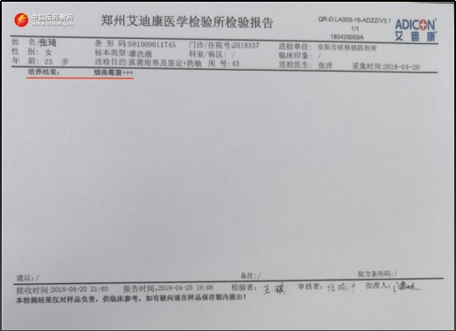▲ Untersuchungsbericht von Zhang Qi vom 20. April 2018 vom Zhengzhou Adicon Clinical Laboratory