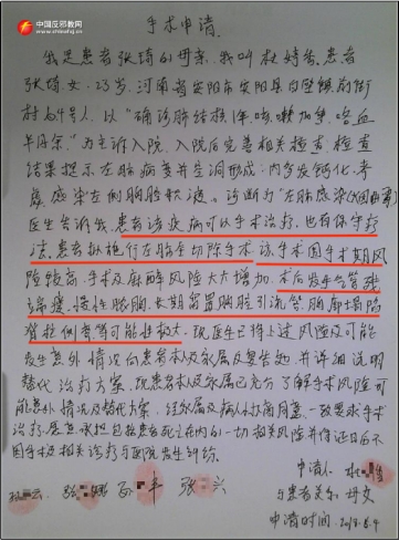 Die Krankenakte von Zhang Qi hält nicht nur fest, dass der behandelnde Arzt Cui Guanghui vor der Operation Zhang Qis nächste Angehörige zusammenrief und sie ausführlich über den aktuellen Zustand, die Notwendigkeit der Operation und alternative Behandlungsmöglichkeiten informierte. Zhang Qis Mutter Du Tingxiang verfasste sogar handschriftlich einen „Operationsantrag“ für das Krankenhaus. Auch Zhang Qis Vater und ihr Ehemann Sun bestätigten durch ihre Unterschriften und Fingerabdrücke auf den entsprechenden Dokumenten ihre Zustimmung.