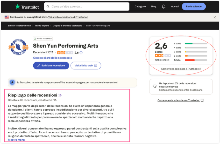 Anmerkung der Redaktion: Italienische Zuschauer berichteten auf der globalen Bewertungsplattform Trustpilot italienische Version, dass sie nach negativen Bewertungen wiederholt von den Organisatoren der Shen-Yun-Aufführung, die der Falun-Gong-Bewegung nahesteht, kontaktiert wurden. Die Organisator...